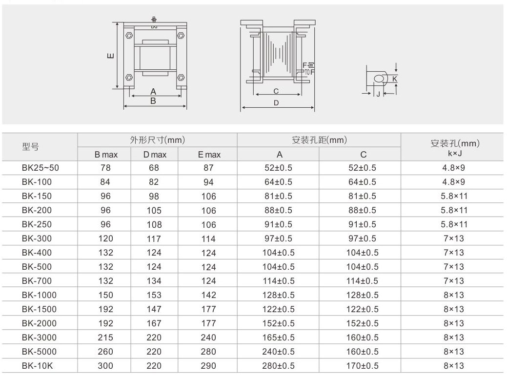 BK系列控制變壓器適用于50-60Hz電壓至500V的電路中,通常用作機床控制電器局部照明燈及指示的電源之用。本類型變壓器按結構可分為殼式,按安裝方式可分為立式。